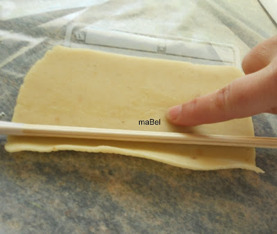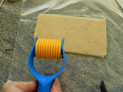 esta vez estiramos fino el mazapan, mas o menos del grueso de un palillo y lo emparejamos, recortando los lados, dejandolo de forma rectangular