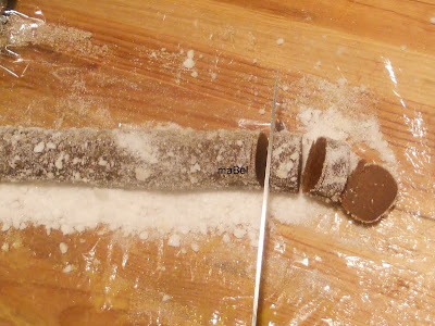 hacemos un gran cilindro de mas o menos 2 cm de diámetro. Lo envuelves en film, y lo dejas en el congelador o freezer, 1 hora hasta que se ponga bien duro