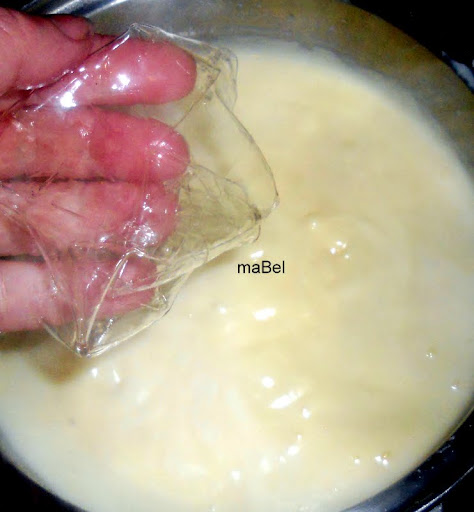Para llevar a enfriar, la tapamos con un papel film, de manera que quede tocando la crema, así no se forma una pelicula dura en la superficie