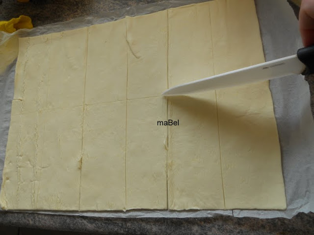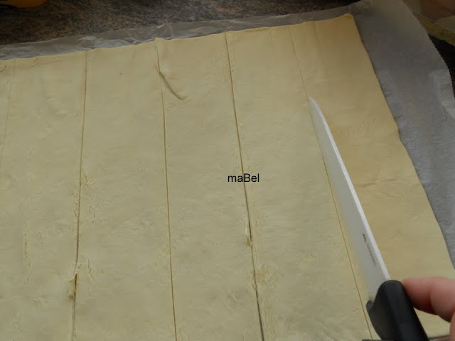 El hojaldre lo dividimos en tres partes iguales, y lo cortamos en 3