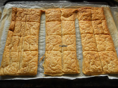 Si quieres que el hojaldre no te suba en el horno ponlo sobre la bandeja del horno, pero entre dos papales de hornear y encima otra bandeja de horno, salen muy finos y muy crujientes.