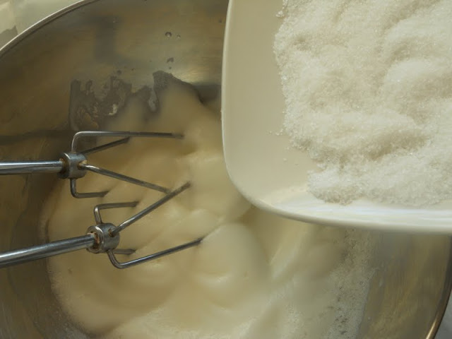cuando está bien espumosa, le vamos agregando de a poco, mientras seguimos batiendo, 20 gr de azúcar, hasta que se haga un merengue