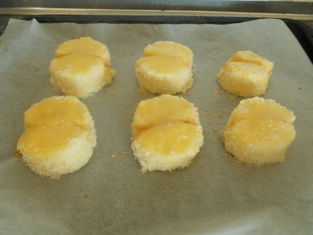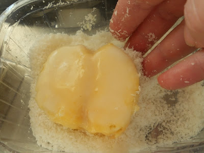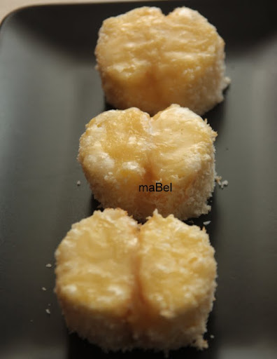 y a los costados con coco rallado. Acuérdate que si haces los rellenos de Bergara, no llevan coco, y van paraditos, en vez de así acostaditos. Busca en internet que hay fotos de este dulce.