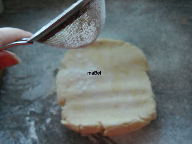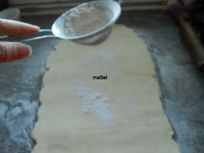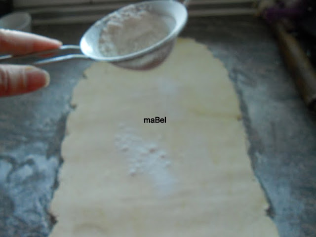 estiro la masa, espolvoreando con harina, dejando lo mas fina que pueda. La espolvoreo con harina, si veo que puse mucha, entonces con la mano retiro el excedente