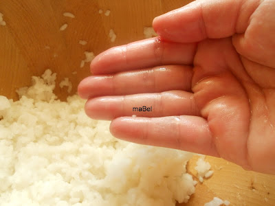 Mójate las manos para agarrar el arroz, así no se te queda pegado, cada vez que agarres arroz, te las mojas, ten un cuenco con agua para facilitarte el tema