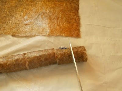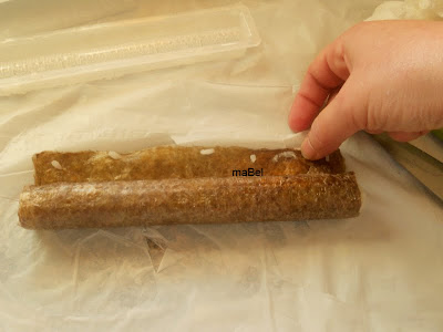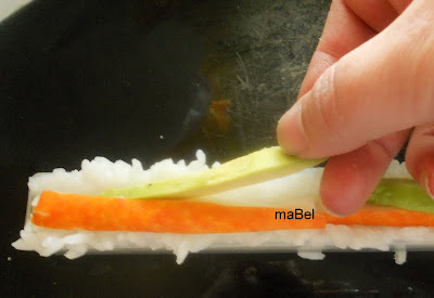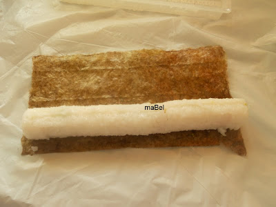 enrollamos, y antes de llegar al final, ponemos unos granitos de arroz, que aplastamos, para usarlos de pegamento para el alga