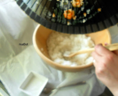 y le vamos agregando la mezcla de vinagre removiéndolo, mientras, con un abanico lo vamos ventilando para enfriarlo y que no nos quede apelmazado. Si no tienes un abanico, un ventilador de lejos también sirve.