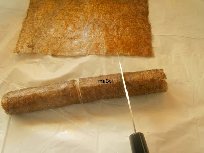 terminamos de enrollar y cortamos al medio el rollo, el cuchillo debe estar filoso y limpio, conviene pasarlo por agua fría cada vez y secarlo con un paño para cortar mejor