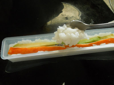Este sushi está hecho con un moldecito de plástico que se vende en las casas gourmet. Yo hace mucho que lo tenía, y nunca se me dió por usarlo, porque como tenía la esterilla, ya estaba acostumbrada así. Cuando los iba a hacer, al buscar la esterilla, lo ví y me dije... es el momento, y me puse manos a la obra.