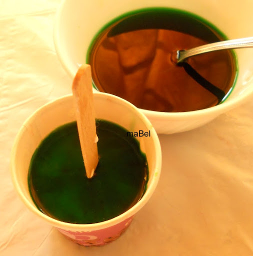 Para la parte verde mezclamos 100 cc del zumo de manzana con colorante verde. Llevalo a refigerar hasta el momento de usarlo.
