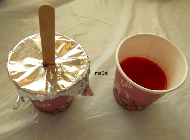 tapamos el vasito con un papel albal, o metalizado, y clavamos el palito en el centro. Fijate en el video cómo lo hago por si no lo entiendes