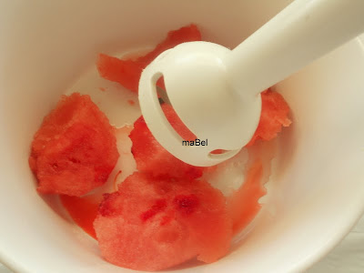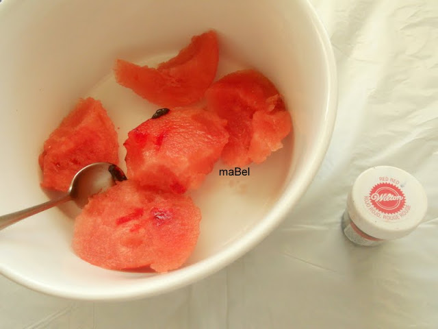 a la pulpa, le agregamos un poco de colorante rojo, pero esto lo puedes evitar de poner si quieres, porque la sandía ya tiene un lindo color