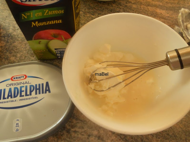 para la parte blanca, el queso con 1/2  cda de azúcar y el resto de zumo de manzana. Llevalo a refigerar hasta el momento de usarlo.
