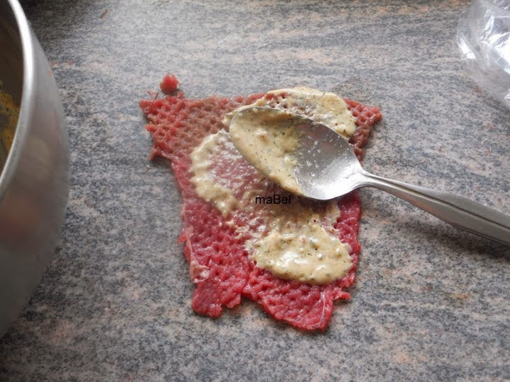 con un martillo de cocina, o con un palote de amasar, aplana los filetes, cortados de la misma medida que el recipiente donde los vayas a meter