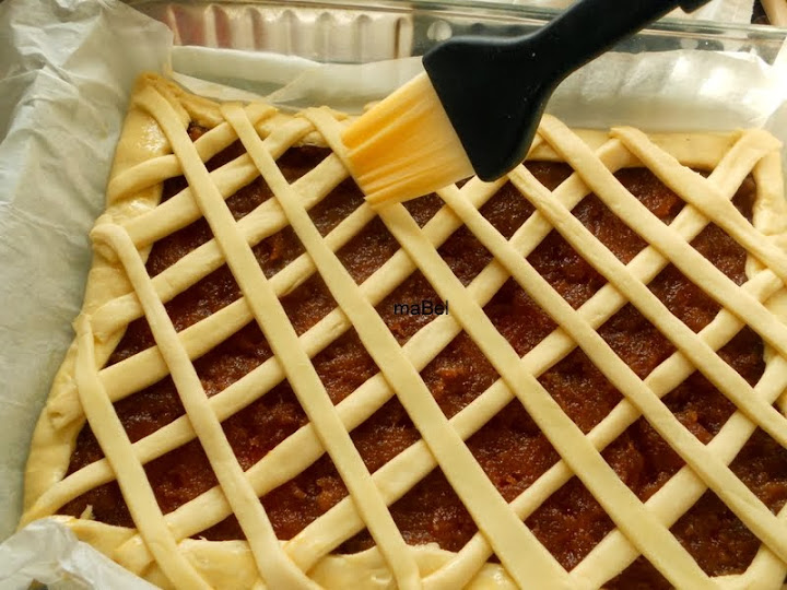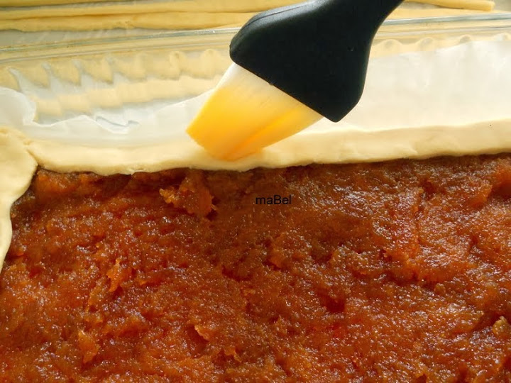 cuando terminamos, pincelamos las tiras con huevo, y lo horneamos a 180ºC mas o menos 30 minutos, fijate, si se doró la masa, y si hace falta, la dejas un poco mas